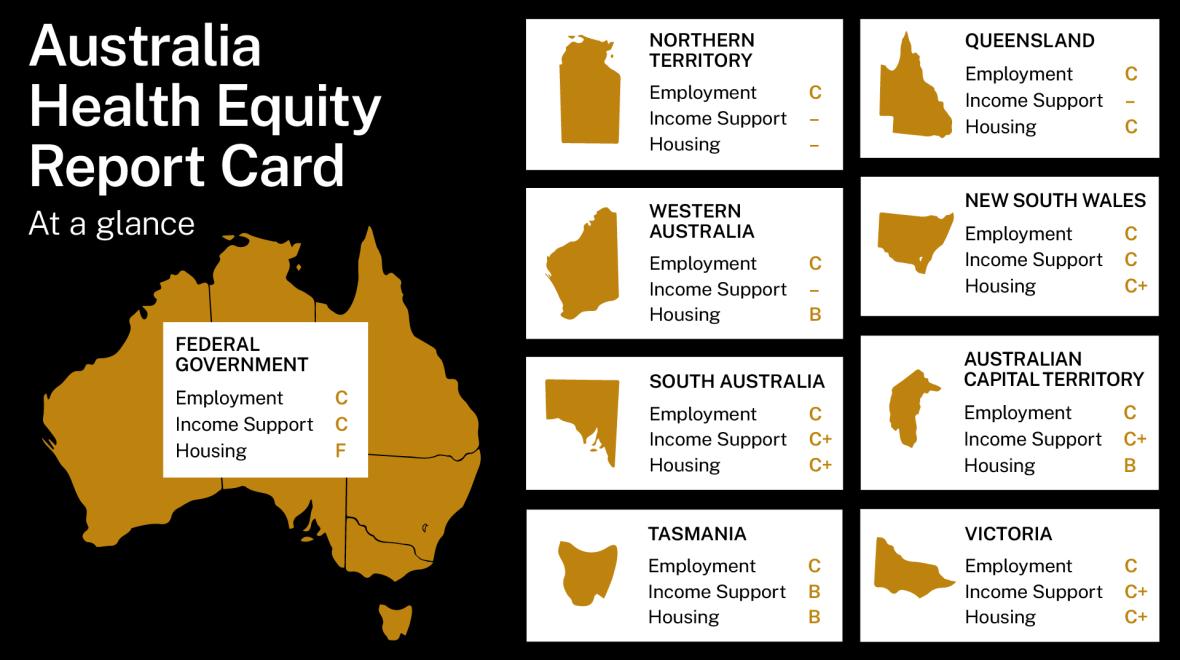 报告指出,各级政府在就业政策方面的反应得分为C级,大部分政策只是为企业提供资金,未能解决就业不稳定问题,维持现状并未为改善卫生公平做出贡献。各政府在收入支持政策方面的得分也有所不同,其中南澳大利亚和维多利亚政府得分略高。